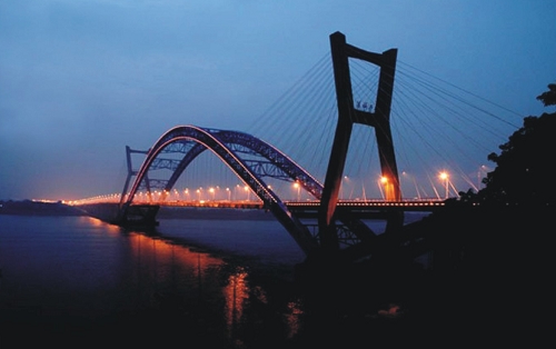广西南宁永和大桥 全长1402.15米,主跨338米,单跨下承式钢管砼变高度桁式有推力无铰拱桥,2004年10月建成通车。共46个吊装节段,单节段最大吊重121.8吨,公司承担吊装工程。
