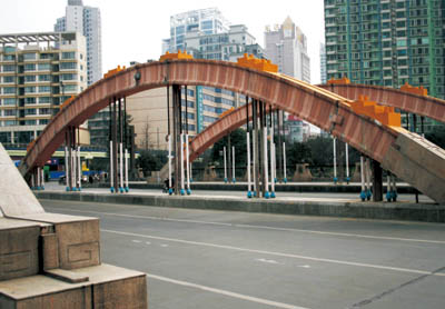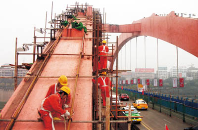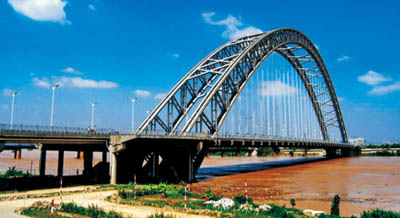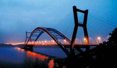 全长1402.15米,主跨338米,单跨下承式钢管砼变高度桁式有推力无铰拱桥,2004年10月建成通车。共46个吊装节段,单节段最大吊重121.8吨,公司承担吊装工程。