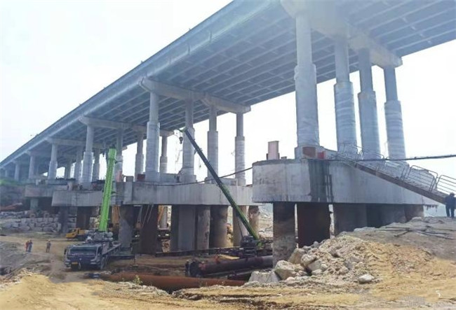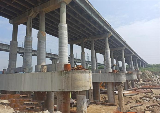 石亭江大桥于2010年建成,由于近年受下游采砂及汛期影响,加大了洪水对河床的冲刷,数次加固新增设的承台和桩基也被冲刷外露严重。本次施工对石亭江大桥7-10号桥墩进行了以下处治:原桥上部结构保留、系梁及墩柱以下拆除,利用原始数据排架墩位设置双柱墩,桩基采用80m长、直径2.5m钻孔灌注摩擦桩来大大提高抗河床下切能力,原2013年增设的承台当此次处治桩基施工平台,墩柱处治完毕后,进行河道疏浚利于泄洪,拆除2013年增设的7-9号墩承台及其下出露河床面的桩基。