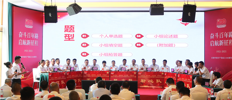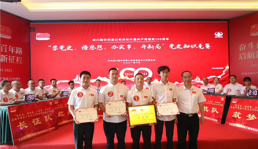 让党史学习“火”起来, 营造“比学赶超”良好氛围。本次知识竞赛已筹备一月有余,经过六月初7000余人名职工和产业工人自发参与网络初赛答题,到6月17日42家单位395名党员、预备党员及积极分子共同参与线上集中复赛答题,公司高质量高标准把关,甄选出22名党建精英进入总决赛,此次竞赛涵盖了中国共产党建党百年来的革命史、新中国史、改革开放史、社会主义发展史等选题内容,共设五个环节,分为个人必答题、小组必答题、抢答题、风险题、附加题。随着比赛向前推进,现场竞赛“火药味”逐渐浓烈,台上选手自信满满胸有成竹,台下观众津津有味全程互动,长征队、红船队、天路队、星火队、初心队、启航队、筑梦队七个队伍你追我赶,还有“幸运22”号实力加持、推波助澜,将活动氛围推向高潮。经过激烈角逐,天路队、初心队和“幸运22”、筑梦队分别荣获党史知识竞赛决赛的第一名、第二名、第三名,公司领导亲自为获奖队伍颁发奖牌和荣誉证书,和所有参赛选手合影留念。“在党史竞赛决赛开始前,我还是花了大量时间做准备, 如查看背诵‘学习强国’学习平台、党史学习教育官网号上的党史知识、党史事件,让自己对一些模糊的知识变得更加清晰。而在比赛现场,通过问答的方式,像是一种‘温故知新’,让党史学习效率得到提高,更像是一种“隔空对话”,重走了一次红色岁月”,参赛选手如是说。本次知识竞赛结合公司工作实际,将川桥“发家史”融入到党史学习教育中,以赛促学、以学促行,坚定了信仰之“基、补强了精神之钙。