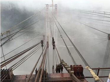 大桥采用无支架缆索吊装施工技术,该技术工艺极其复杂,C100砼是首次在国内桥梁工程应用,其科技含量极高且对桥梁工程发展意义重大。由于古蔺地处山区交通极为不便,气候条件恶劣,开工时间较原计划晚了一年之久,工期紧、施工难度极大,面对重重困难,项目部全体员工在领导班子的带领下充分发扬了伟大的“川桥人”精神,勇于担当,敢于破难,团结一心,艰苦奋战,大力开展科技攻关,科学组织施工生产,取得了一个又一个的阶段性胜利,2014年3月20日拱座开挖,2014年5月拱座施工完成,2014年10月交界墩施工完成,2014年11月7日索塔拼装,2014年12月31日索塔拼装完成,2015年1月31日缆索系统形成,2015年2月6日开始吊装主桥钢管劲性骨架,2015年3月28日劲性骨架合龙,50天实现了主桥合龙,其中凝聚了“川桥人”的艰辛、智慧和汗水。