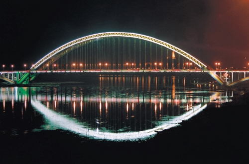 全长1375米,主桥长294米,主跨202米,钢管砼桁架拱桥,1997年10月建成通车。